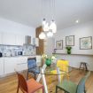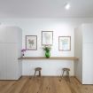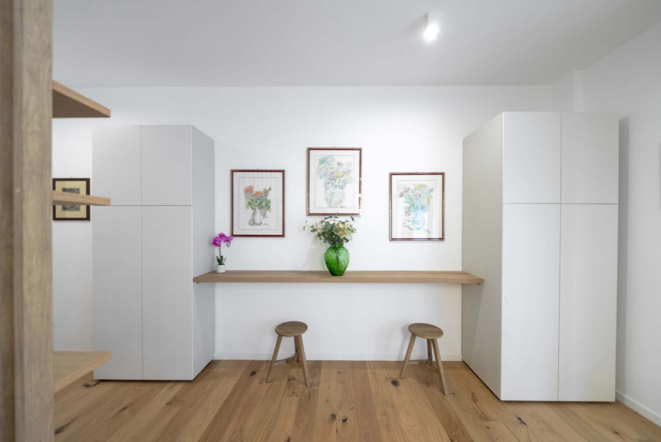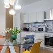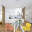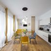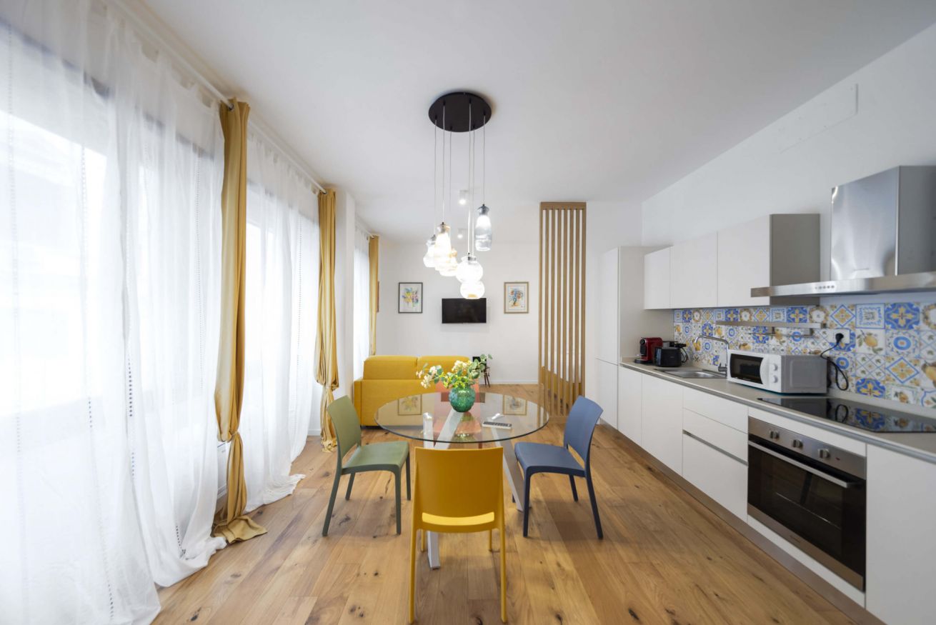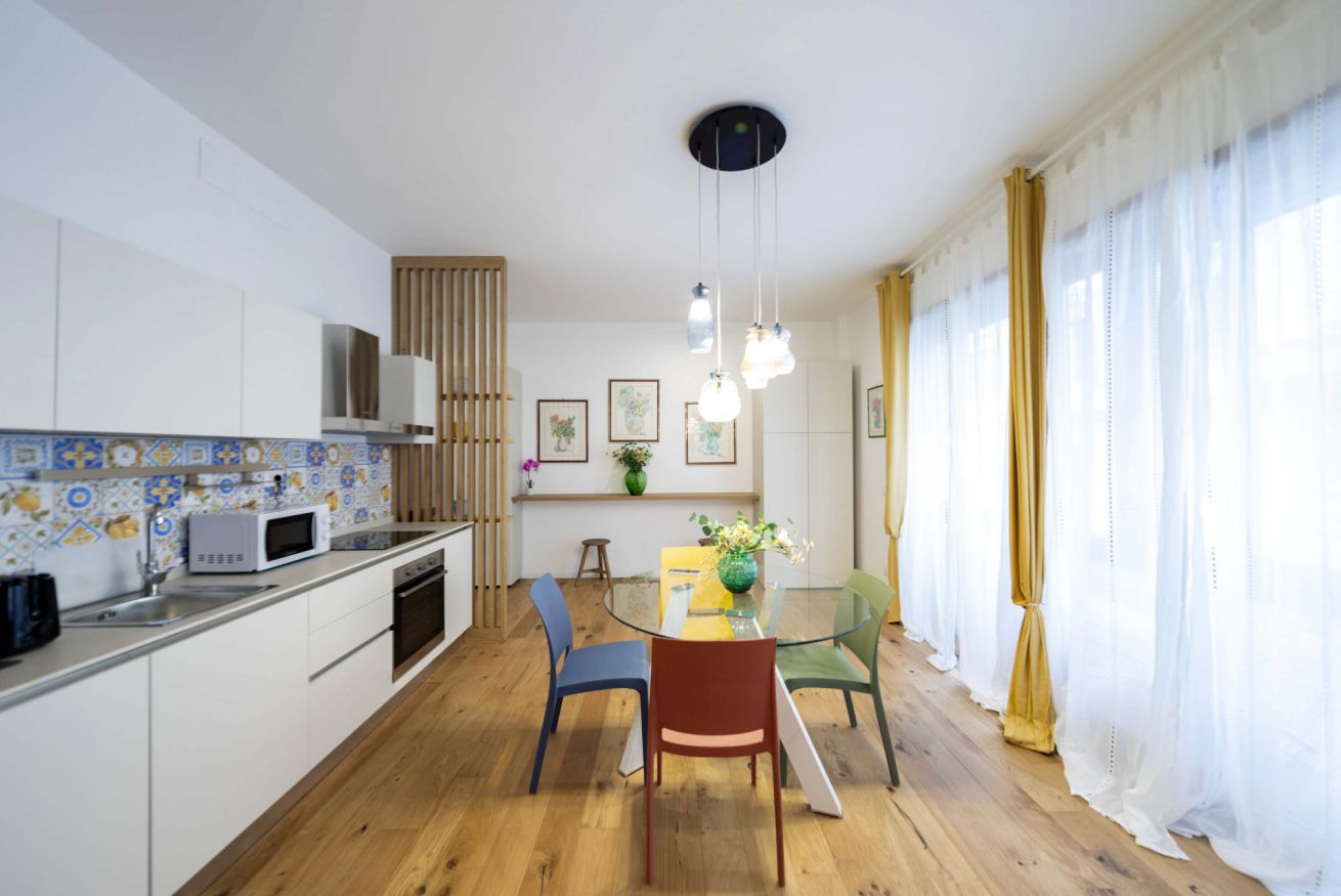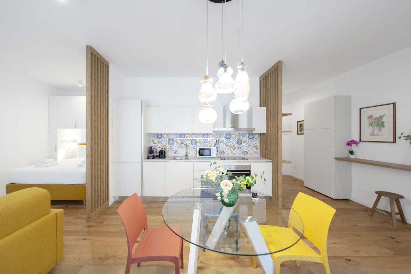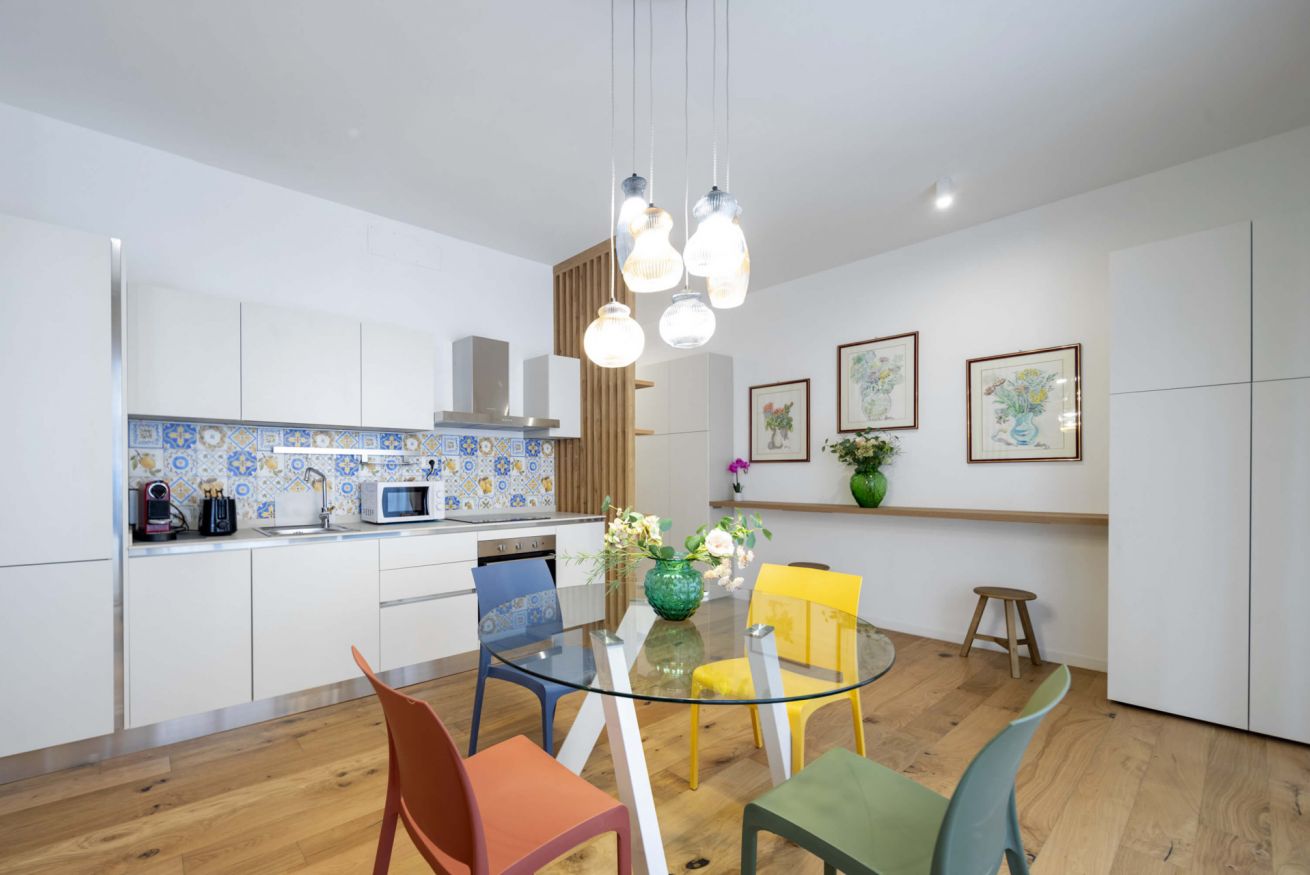 The quiet and luminous living area features an open kitchenette with induction hobs and a dining table.